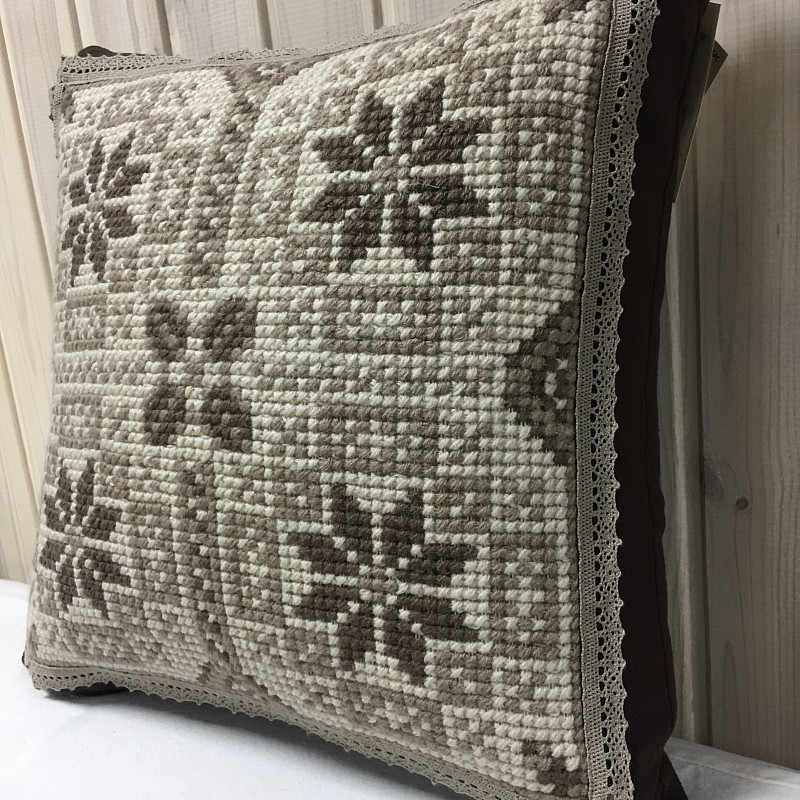 Подушка с кружевом Четыре звезды капучино создана мастером дизайнерской студии. Отличается интересно составленным орнаментом из украинских узоров. Изделие выполнено в спокойных оттенках капучино. Украшено вышивкой ручной работы, которая имеет кружевное обрамление.