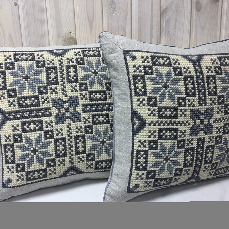 Славянский оберег – вышитая подушка Четыре звезды серо-голубая. Орнамент известен как один из древнейших символов, который использовали для вышивки на одеждах и домашнем текстиле. Призван защищать своего владельца и весь его род.