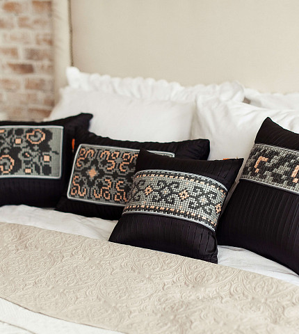 Дизайнерские подушки разной формы вышитые вручную простым и болгарским крестом, позволят каждой найти только ее место, наделяя дом изысканностью и величественной красотой.