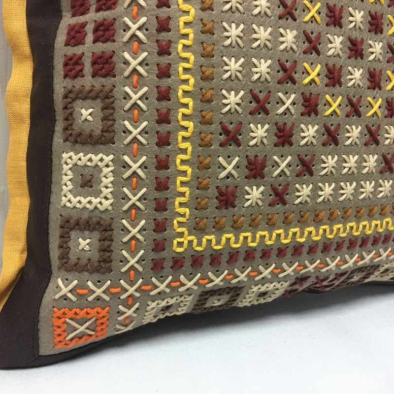 Диванная подушка Кофе-карамель, выполнена по авторским эскизам. Ее главным украшением является оригинальная вышивка ручной работы. Однако не менее оригинально то, что орнамент нанесен на фетровую вставку в наволочке. Благодаря такому соединению, узор смотрится более выразительно.