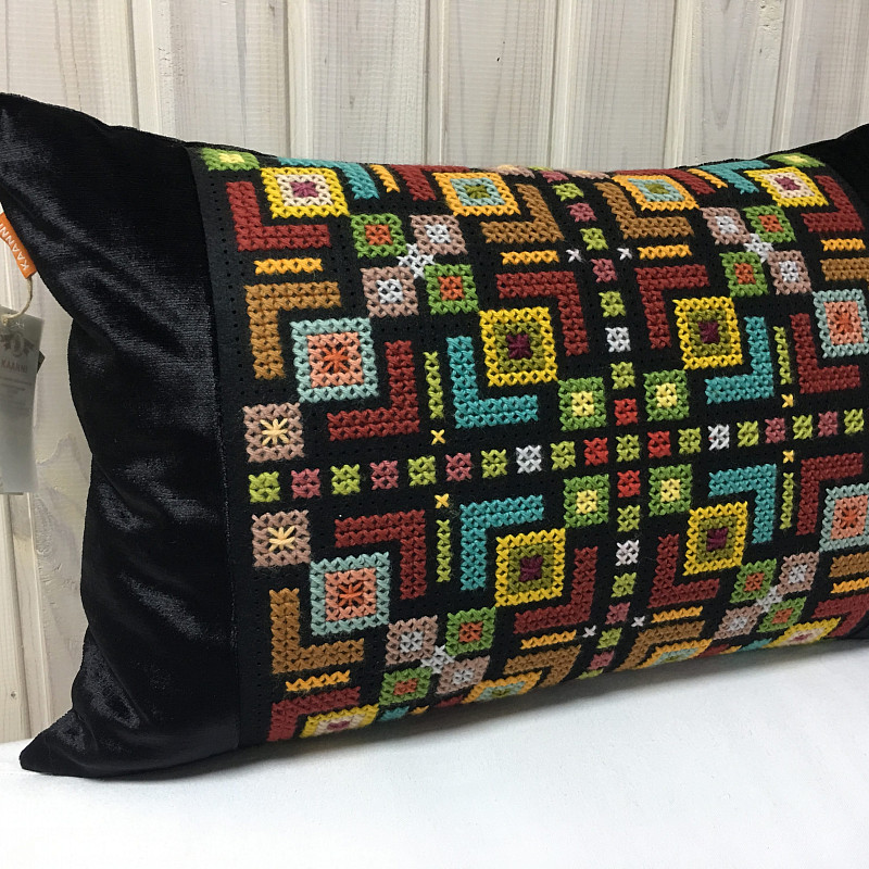 Декоративная наволочка на диванной подушке вышита вручную. Сам же орнамент составлен из узоров, привычных для сердца каждого украинца и украинки. В нем отображены символы с рушников и этнической одежды, а потому изделие так близко и душевно воспринимается.