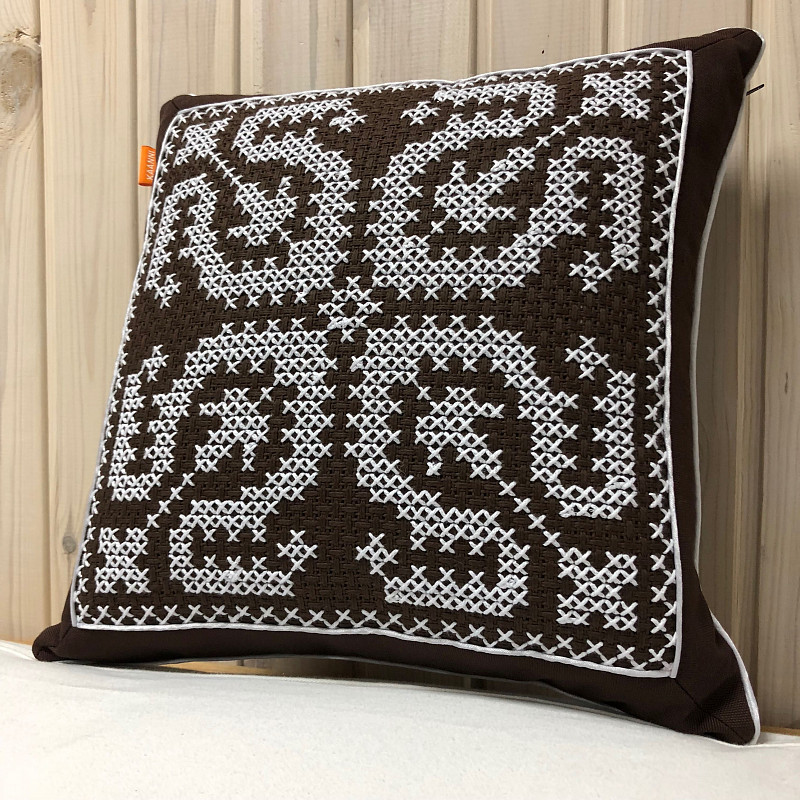 Дизайнерские подушки КААННИ идеально подойдут на подарок близким людям. Все узоры неповторимы, поэтому каждая из них становиться эксклюзивной. Обратная сторона – крашеный лен. Наволочка легко стирается и быстро сохнет, не теряя своего первоначального вида.