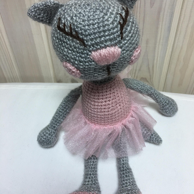 Кошка балерина в розовом – милое создание авторской работы. Выполненная с помощью крючка, пряжи и синтепуха, она имеет размер 38 см. Подходит для игр маленьких детей, однако может стать и украшением интерьера комнаты девочки подростка.