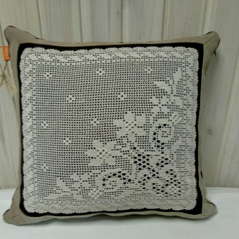 Дизайнерская подушка Кружевная мелодия капучино с кружевом имеет квадратную форму с габаритами 45х45 см. Наволочка пошита из натурального льна и имеет тонкую молнию для удобства ухода за изделием.