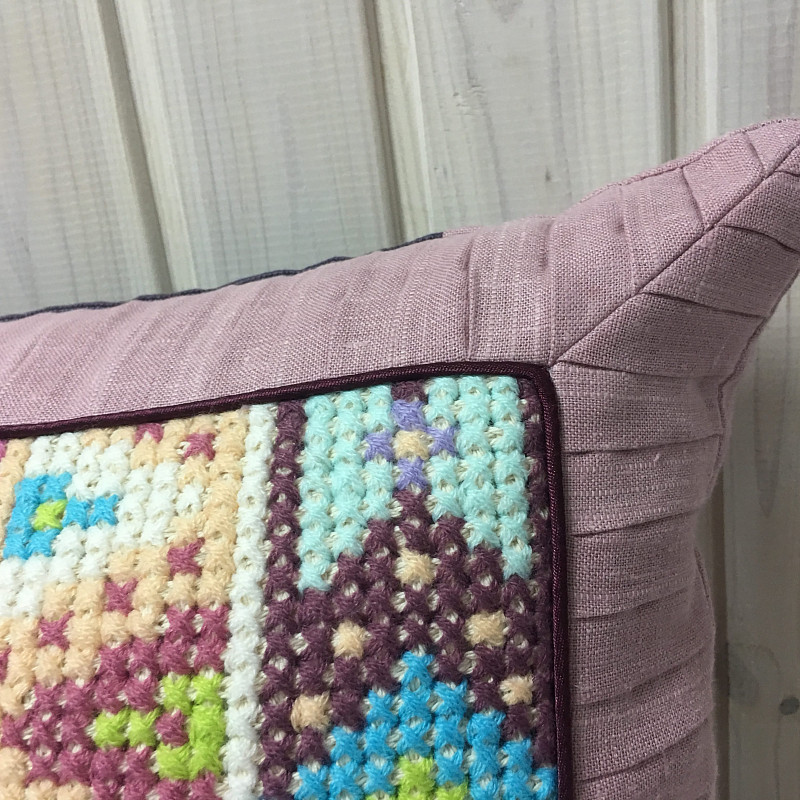 Орнаментальная большая, длинная подушка выполнена в лиловом цвете, который является символом загадочности. Узор вышит вручную и имеет сложное переплетение оттенков и элементов орнамента. Авторская работа по дизайнерским эскизам достойна восхищения и станет настоящим украшением любого интерьера.
