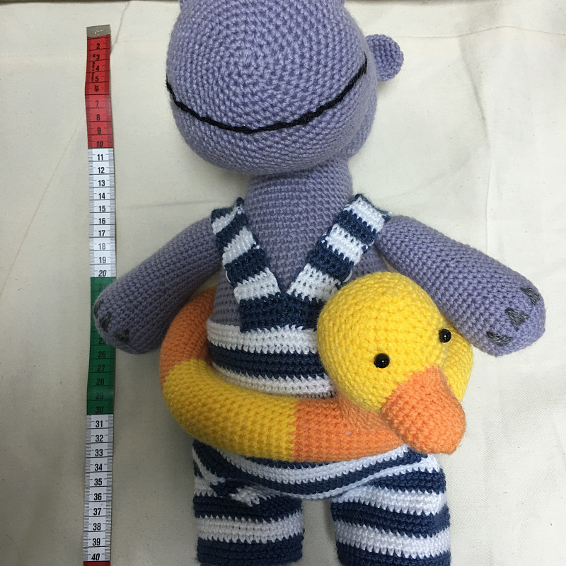 Особенностью большой игрушки вязаной крючком, являются прилагающиеся аксессуары. Так на гиппопотамчике надет костюмчик в полоску для плавания, кепи и спасательный круг. Все элементы снимаются, благодаря чему малышу будет вдвойне интереснее. Примененные материалы для изготовления игрушки гипоаллергенны и могут стираться. Синтепух после сушки легко поддается восстановления формы. Достаточно выровнять руками фигуру, если замечено замятие.