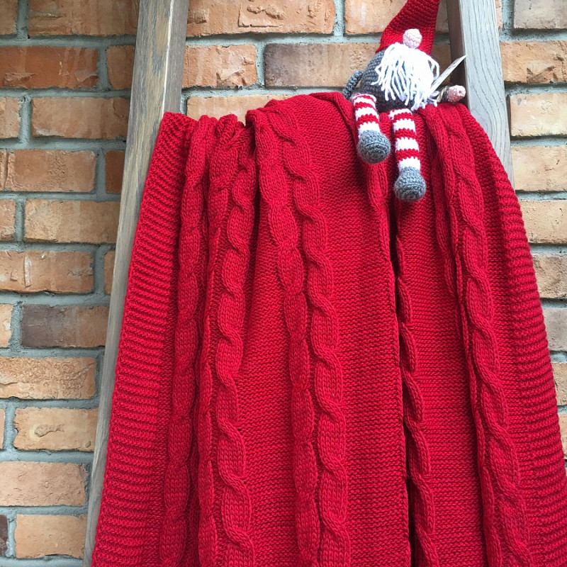 Плед красного цвета связан по эскизам дизайнера. Авторская работа мастера студии KAANNI выполнена на высшем уровне. Полотно в косах смотрится эффектно. Чтобы оно весь срок службы оставалось внешне опрятным, по краю сделана широкая окантовка в перпендикулярный косам рубчик. В составе пряжи присутствует шерсть и акрил в равных пропорциях. Это делает изделие износоустойчивым, теплым и воздухопроницаемым.