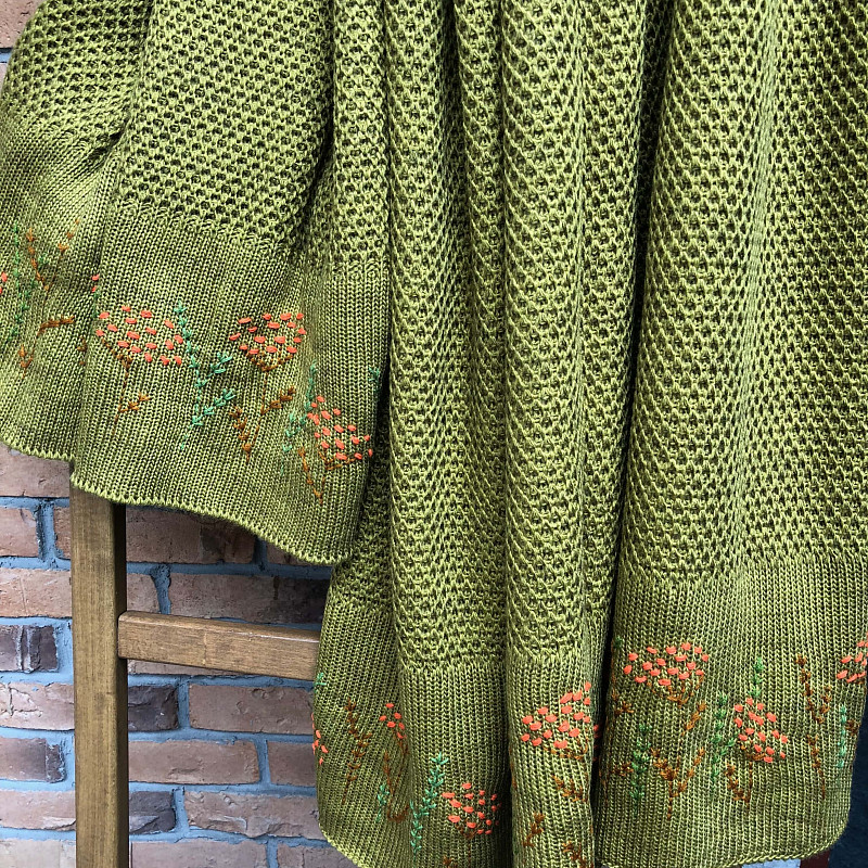 Каким бы пасмурным не был день, и тусклым освещение, льющееся из окон, сделать интерьер по-весеннему освежающим и радостным поможет вязаный плед в соты горчичный. Благодаря приятному оттенку и фактурному узору изделие заберет на себя внимание, и отвлечет от мрачных мыслей. Дополнительно плед украшает ручная вышивка, которая делает его ярким и необычным.
