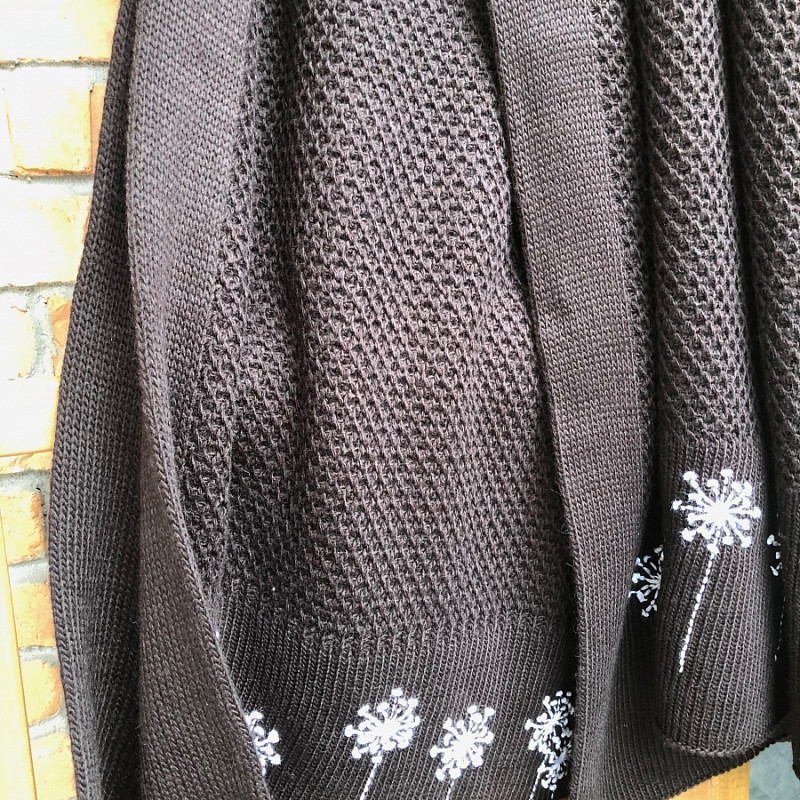Сделать интерьер комнаты выразительным и оригинальным поможет красивый вязаный плед шоколадного цвета. Изделие имеет глубокий тон и рельефный рисунок полотна. Дополнительно, по широкой окантовке присутствуют вышитые белые одуванчики, которые смотрятся ярко и контрастно.