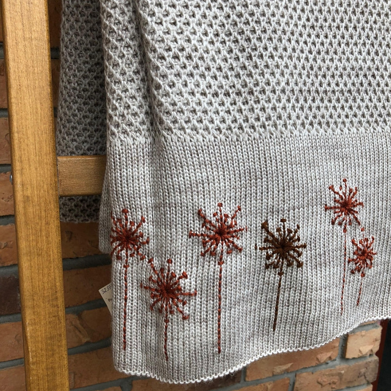Плед бежевого цвета связан из пряжи, в которой 50% шерсти альпака и 50% акрила. Это делает его теплым и износостойким. Рисунок «соты» однородный и будет отлично смотреться в комнате с интерьером любого стиля. Присутствие широкой окантовки, по которой вышиты одуванчики, делает вязаный бежевый плед устойчивым к потере формы.