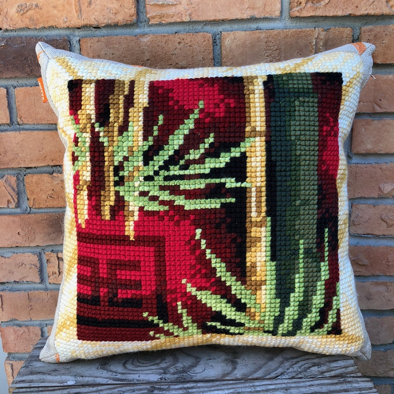 Подушка вышита крестиком, благодаря чему имеет приятную на ощупь фактуру. Растения на фоне зарева заходящего солнца смотрятся футуристично. Создают подходящую атмосферу для созерцания и отдыха.