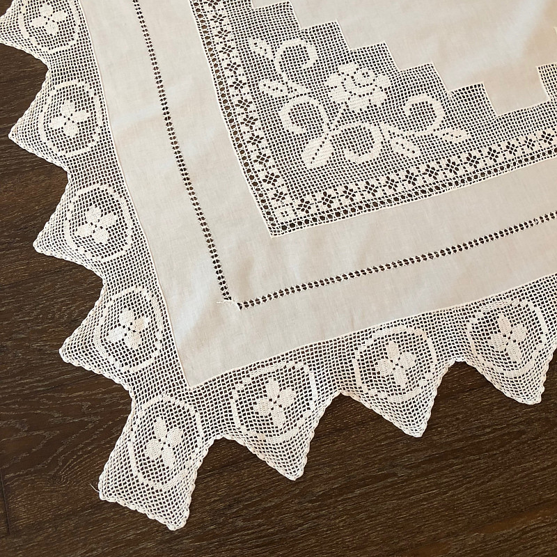 Сделать интерьер воздушным, а атмосферу дома праздничной поможет обвязанная крючком скатерть ручной работы. Хлопковая ткань украшена кружевом по краям и широкой филигранной вставкой, окружающей середину.