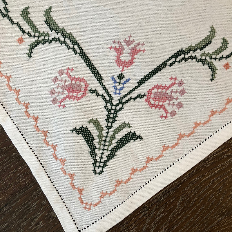 Имея в гостиной чайный столик, хочется его как-то украсить и защитить полировку. Для этого отлично подойдет вышитая скатерть размером 60х60 см. Изделие оформлено узором из тюльпанов, которые своими длинными стеблями охватывают весь периметр полотна. Хлопковая же ткань достаточно плотная, чтобы защитить столешницу от жара блюдца с чашкой ароматного чая.