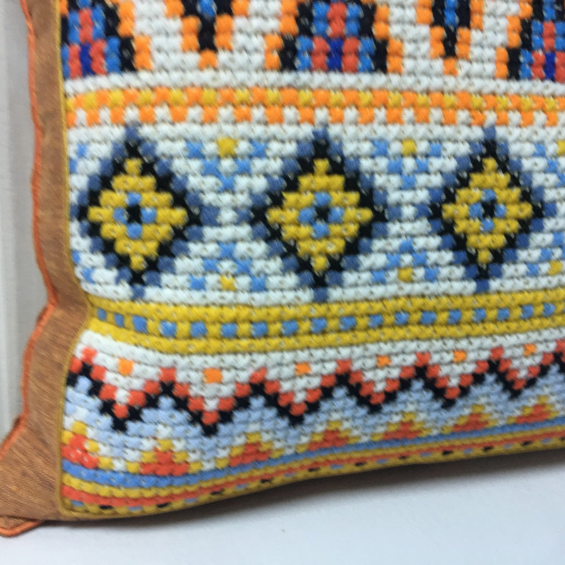 Красивая подушка Солнечный янтарь квадратная, словно специально создана для поднятия настроения. Использованные в вышивке яркие краски вносят дух солнечного лета, раздвигая стены помещения. Заставляет забыть, что вы находитесь в доме.