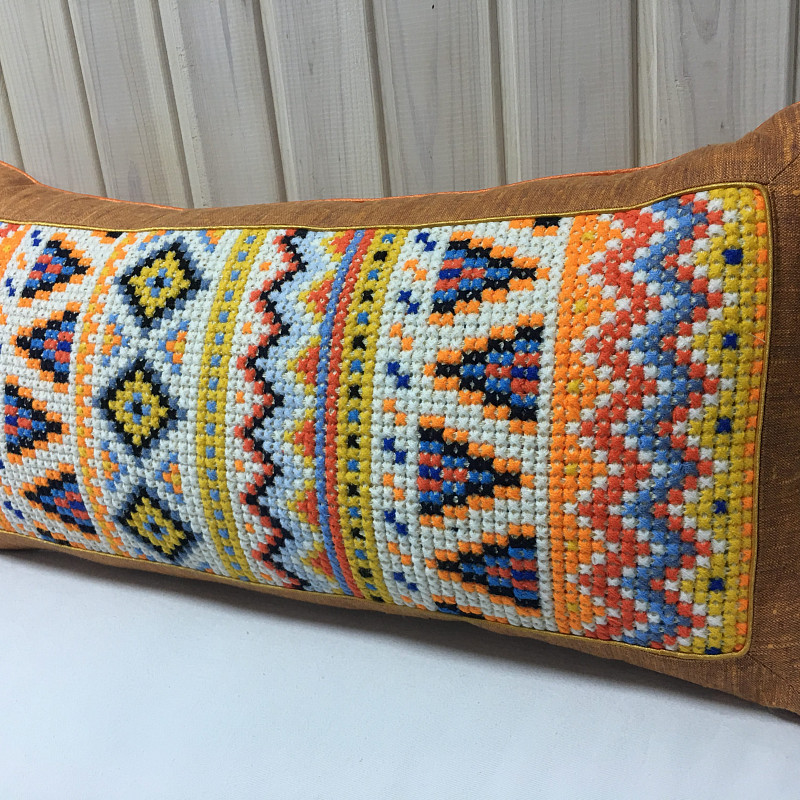 Яркая дизайнерская подушка имеет размер 35 на 70 см. Является авторской работой мастера студии KAANNI и изготовлена в единственном экземпляре. Изделие наполнено синтепухом, благодаря чему подходит не только для украшения интерьера, а и для отдыха на ней.