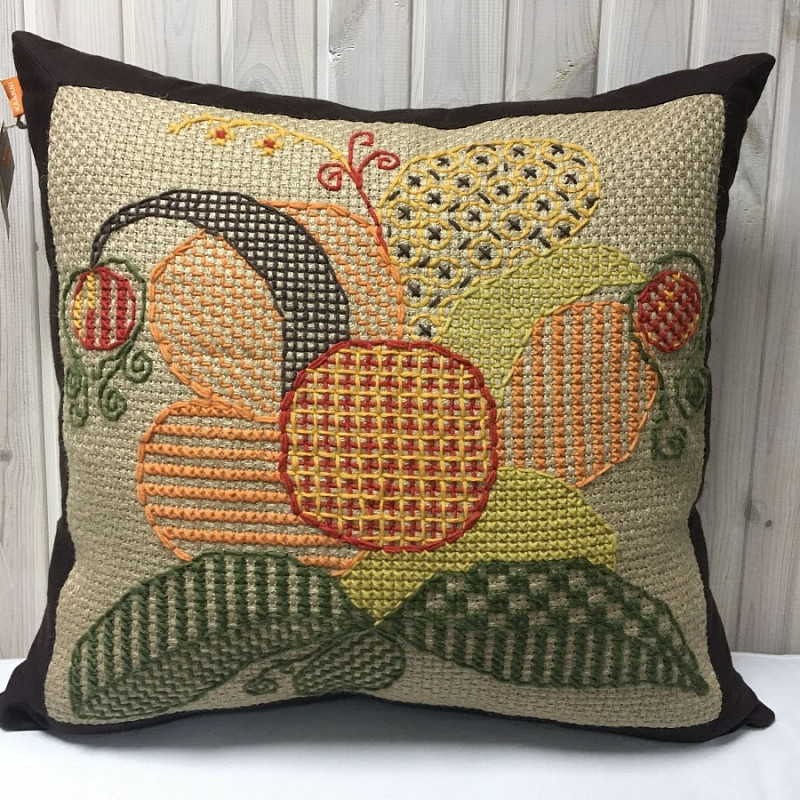 Вышивка на оригинальной диванной подушке придаст очарования всему интерьеру. С ее помощью убранство комнаты будет выглядеть по-новому. Интерьер станет более мягким и уютным. Для возможности использовать подушку не только в качестве декора помещения, а и для отдыха на ней, наполнителем служит синтепух. Наволочка же пошита из черной хлопковой ткани и может сниматься для ухода за ней.