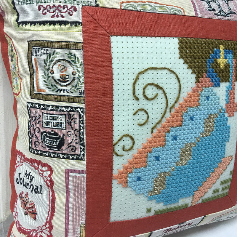 Интернет-магазин декоративных подушек представляет изделие с вышивкой ручной работы. Для пошива наволочки выбран материал гобелен с тематическим рисунком. Все в ней говорит о времени чаепития и призывает расслабиться за чашкой напитка с комфортом.