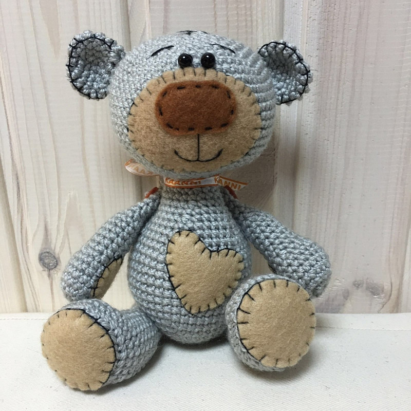 Работа выполнена в дизайнерской студии KAANNI по авторским эскизам. Украшена плюшевым сердечком на туловище и затылке. Выполненный крючком мишка амигуруми наполнен синтепухом, а пряжа для него использована акриловая. Благодаря таким материалам, игрушка гипоаллергенна и безопасна даже для самых маленьких. К тому же фактурная вязка поможет развить тактильность пальцев ребенка, что важно в нежном возрасте.