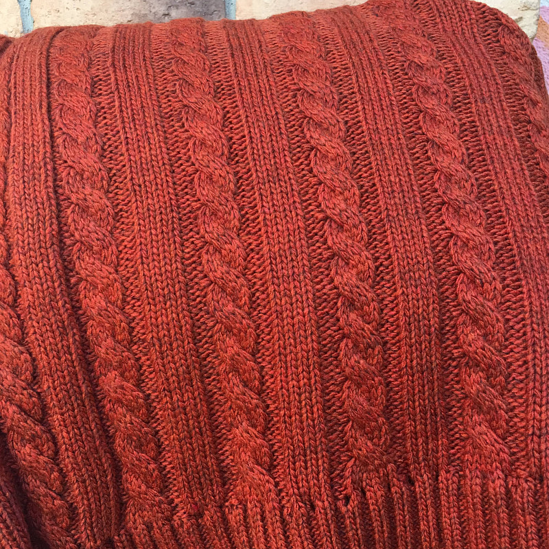 Семейный вязаный плед Терракот, создан с рисунком, где косы и гладь чередуются. Цвет полотна хоть и яркий, все же достаточно светлый, чтобы гармонично смотреться в спальной комнате, с интерьером в постельных тонах.
