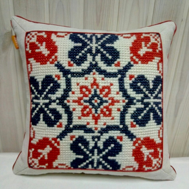 Маленькая подушка Звезда Богородицы красно-синяя украшена ручной вышивкой крестом. Орнамент создан по мотивам узоров украинских рушников и считается сильным семейным оберегом.