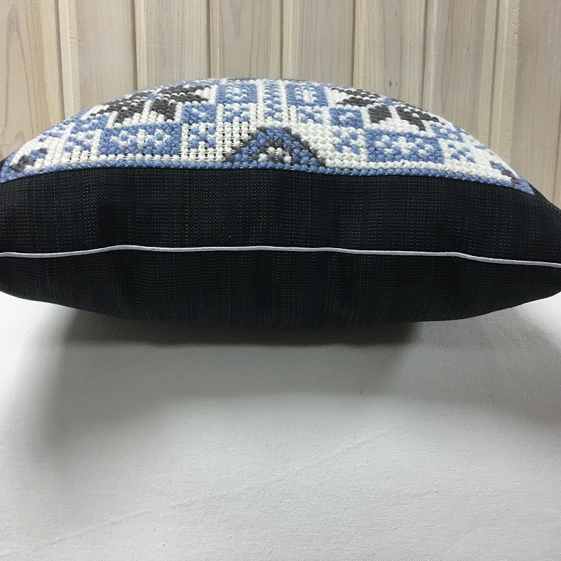 Вышитая подушка «Звезды богородицы бело-голубые» создана всего в двух экземплярах. Известный украинский орнамент выполнен с добавлением черного цвета, что делает рисунок более ярким и выразительным.