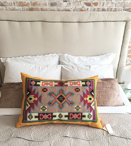 Мастерски подобранное сочетание цветов оттенит интерьер комнаты, где бы подушка ни располагалась. Она настолько красочна, что притягивает внимание находящихся в комнате людей и заставляет по-новому увидеть привычную обстановку.