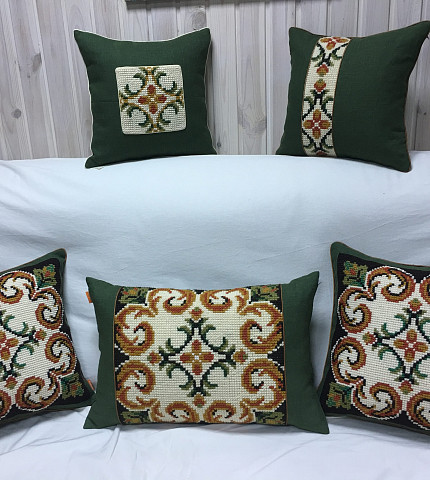 Одним из интересных вариантов орнамента является цветочный, пример которого присутствует в коллекции интерьерных подушек Цветочный орнамент от дизайнерской студии KAANNI. На сочном, темно-зеленом колере наволочки вышиты крестом орнаменты. Подушки с изображением необычных цветов притягивают взгляд, заставляя подолгу всматриваться в изображение. Одни видят цветы лишь в середине, а вокруг представляют рощу деревьев с кучерявой кроной. Другие видят большой цветок с волнистыми лепестками и резной сердцевиной.